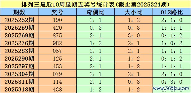 成列三第2025318期(上周星期五)奖号为438。其中奖号奇偶比为1:2,大小比为1:2,012路比为1:1:1。